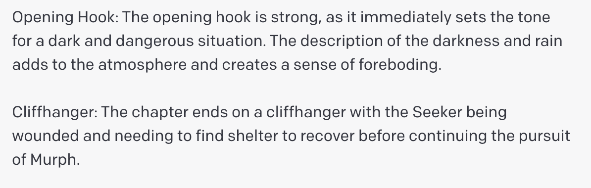 I write serial fiction, so I ask ChatGPT to review my opening hook and my closing cliffhanger. This is critical for serial fiction or page-turning mysteries or thrillers.
